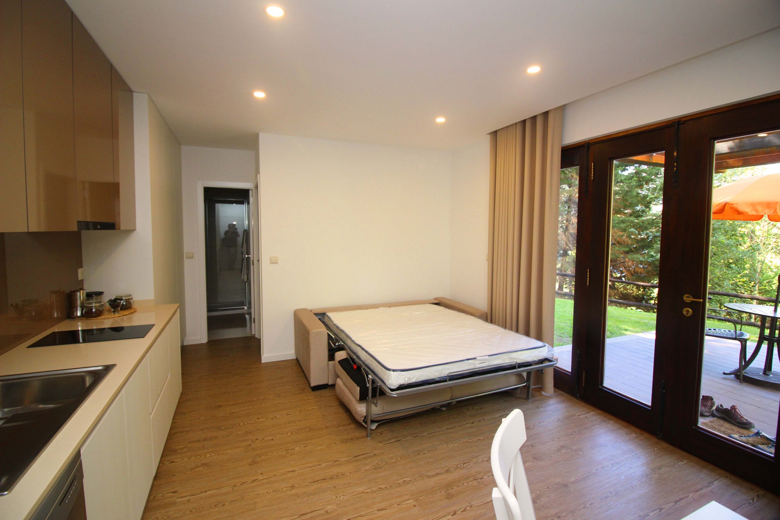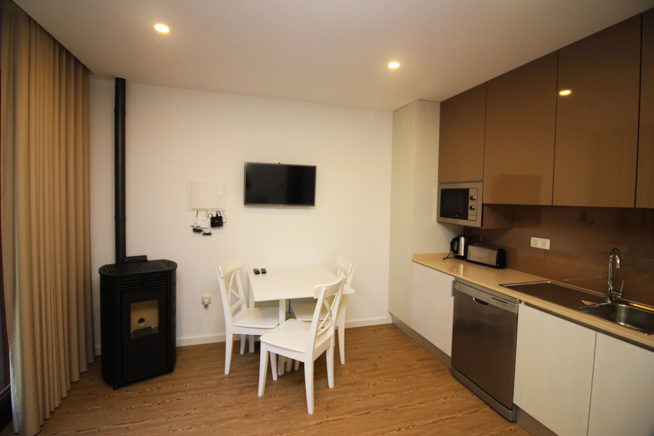 In the electric kitchen, refrigerator, microwave, dishwasher, dishes/cutlery, kitchen utensils and coffee machine are provided.