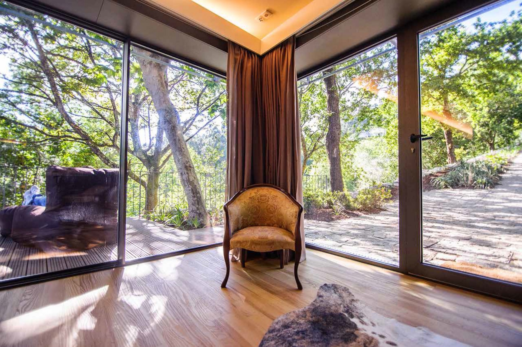 Les environs de ce village est la canopée des arbres. Oui est bien là, mais desengane up, la maison n'a pas été repris dans les arbres! Le sentiment d'être entouré par les hautes branches des chênes et des sycomores en raison du fait que le logement est construit sur la montagne et il a une forte pente. Les grandes fenêtres qui entourent toute la maison transforment les hautes branches des voisins naturels, pas de savoir si elles étaient des résidents les plus anciens de Geres. Les sons des branches et des rayons du soleil passant à travers le feuillage créent un environnement calme et très enclin à se reposer en vacances. Un très capable de vous faire oublier la ville lieu tous les jours.